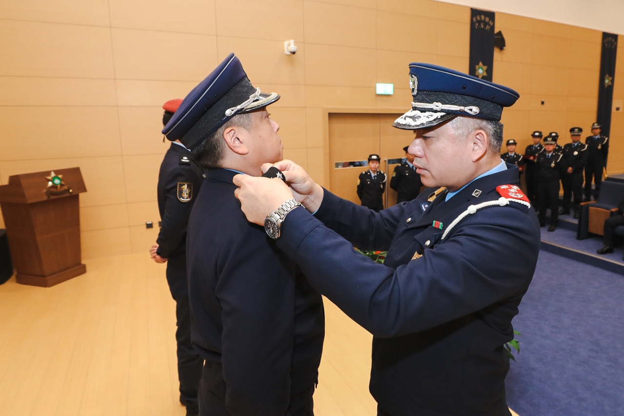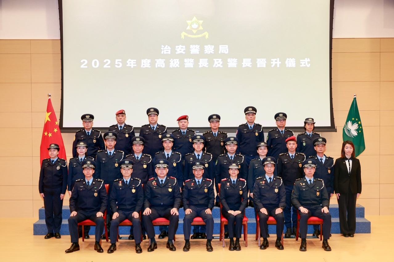 吳錦華局長在儀式中向晉升人員表示祝賀,勉勵他們要嚴明紀律,恪守規矩,以全局思維執行工作,同時須銘記保安司司長的鄭重叮囑,務必深刻領會“慎獨、慎微、慎初”的真義並內化於心,築牢“不敢腐、不能腐、不想腐”的思想與制度防線,共同鑄就一支“廉潔高效、專業精幹”的警察隊伍;並寄語他們要牢記初心使命,以忠誠踐行職責,以擔當回應期盼,以法治守護安寧,以服務溫暖民心,在維護國家安全、守護澳門社會穩定、保障市民生命財產安全的道路上,作出更大的貢獻。