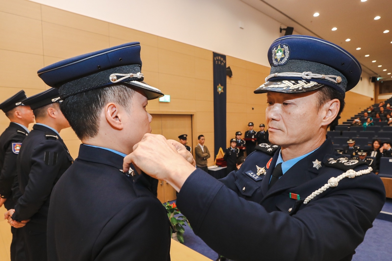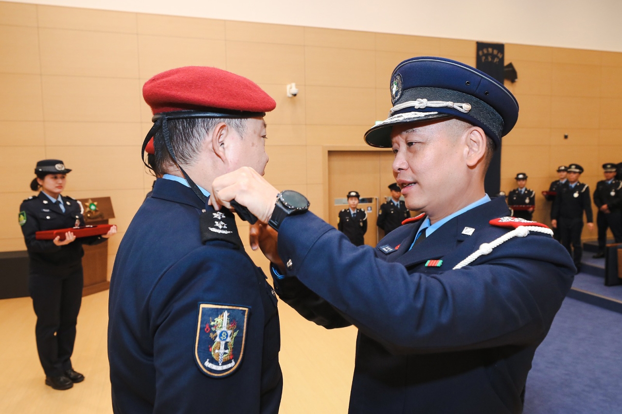 今(21)日上午,治安警察局在總部大樓舉行高級警長及警長晉升儀式,儀式由吳錦華局長主持,梁慶康副局長、伍素萍副局長、鄭俊禧代副局長及各部門主管出席儀式。儀式上,各位晉升的高級警長及警長正式戴上新的肩章,標誌着晉升人員肩負起更大的責任與使命。