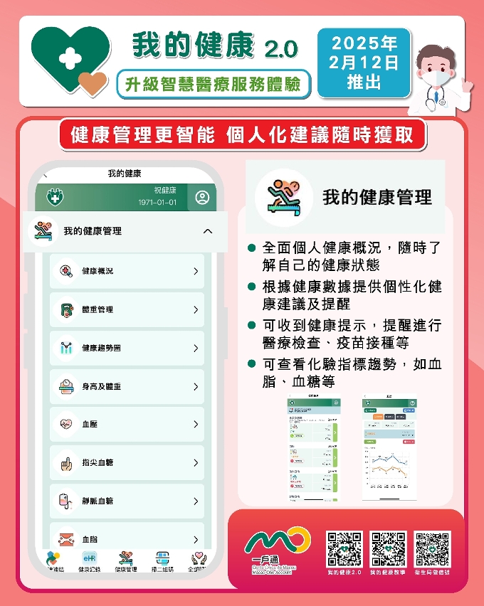 2025年2月推出的全新版本“我的健康”,透過數字化賦能,推動居民使用電子健康管理工具,具有健康數據更全面、健康建議個體化及主動提示更貼心三大特點。在健康數據方面,除體重指數、血壓、血糖外,新增血脂、子宮頸癌篩查、大腸癌篩查與疫苗接種等數據,居民亦可自行輸入身高體重,系統將生成趨勢圖供直觀掌握健康變化;而新增的“體重管理”功能則讓居民回答有關身體活動時間問題後,系統可根據年齡、身高、體重自動計算每日所需熱量,提供個體化健康餐單,同時連結至衛生局建立的食物熱量資料庫,方便居民查找本澳常見食物熱量及所需運動量。系統亦會根據居民的個體健康數據,提供個體化的健康建議,針對性地指導居民實踐健康生活,例如若BMI屬肥胖者將建議多做運動、多吃高纖食物等。此外,系統會定期推送貼心提示,主動提醒居民執行健康管理,例如每年量測血壓與體重、每三年檢測血糖與血脂、流感季前提醒長者接種流感疫苗,以及提醒符合資格者進行大腸癌與子宮頸癌篩查等,協助居民於生活中持續追蹤與管理健康。