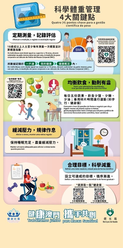 衛生局強調,肥胖是一種複雜的慢性疾病,需要長期、全面且個人化管理;體重管理也不是單純減肥,而是建立可持續的健康生活習慣,目標是長久健康,而非短期體重下降。衛生局以“資源下沉”、“關口前移”、“觀念轉變”三大方向作為政策方向,透過“健康社區”計劃持續推動政府、社區及居民三方協作,力爭在2030年前遏制肥胖率的上升情況,通過普及健康生活方式,從源頭預防慢性病發生,達致全民健康素養提升,實現“幸福澳門”的施政願景。