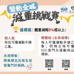- 獎品:減重達3%或以上可獲運動手錶乙隻,若團體組全員達標每組額外獲贈運動用品禮券,未達標者亦可獲贈禮品及營養門診服務;