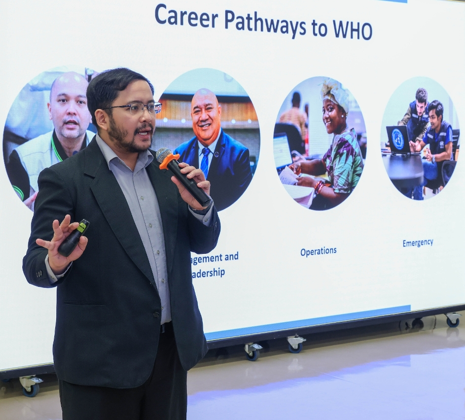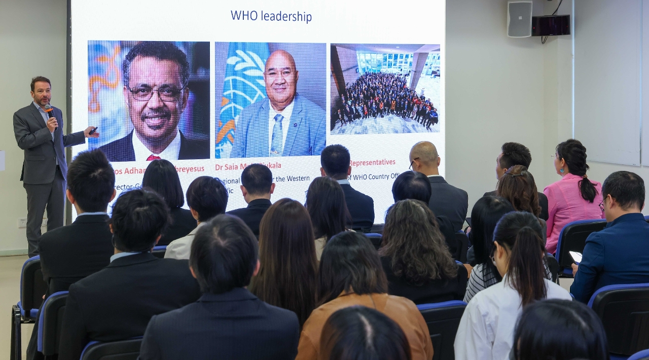 隨後,世衛西太平洋區辦公室執行官員劉岳博士及Tamas LANDESZ主任等代表介紹了世衛組織的成立歷史、架構和主要職能,並先後圍繞世衛的職涯發展、招聘程序、履歷和求職信的撰寫建議,以及筆試和面試技巧等進行講解。代表也分享了個人的就職經驗,為與會學員提供了寶貴的實務參考和啟示,並於宣講會上耐心解答了學員提問,現場討論氛圍熱烈。