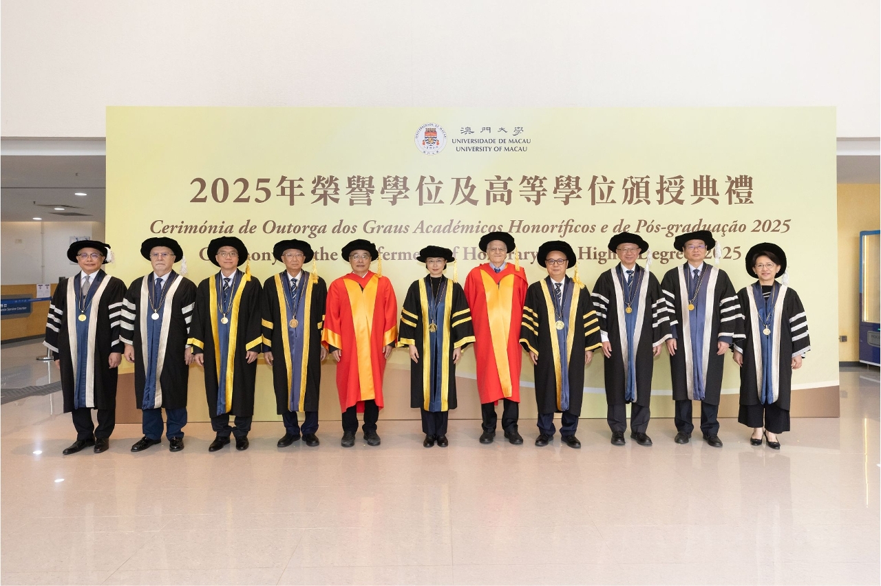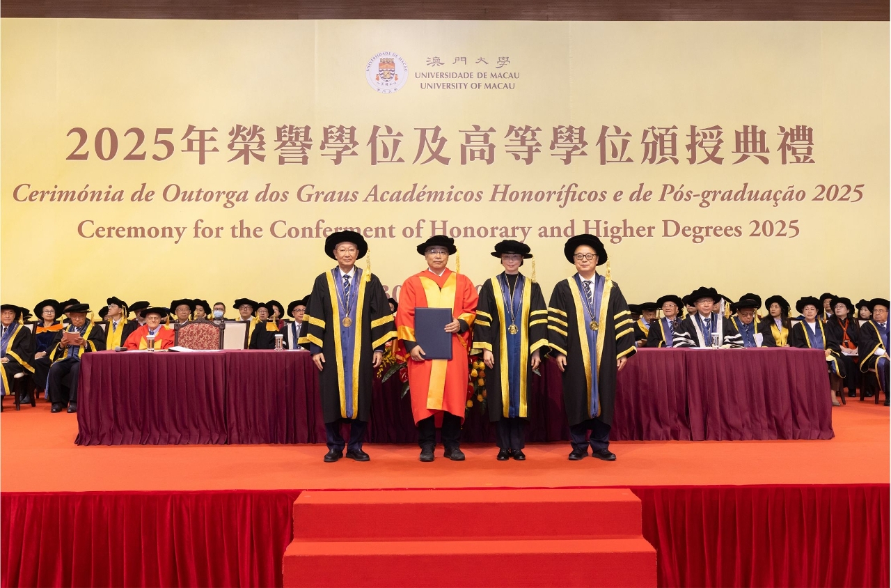 澳門大學今(30)日舉行2025年榮譽學位及高等學位頒授典禮,向材料科學晶體結構領域權威學者張澤及諾貝爾經濟學獎得主湯瑪斯‧薩金特(Thomas J. Sargent)頒授澳大榮譽博士學位,以表彰其卓越成就及為社會所作出的重大貢獻。