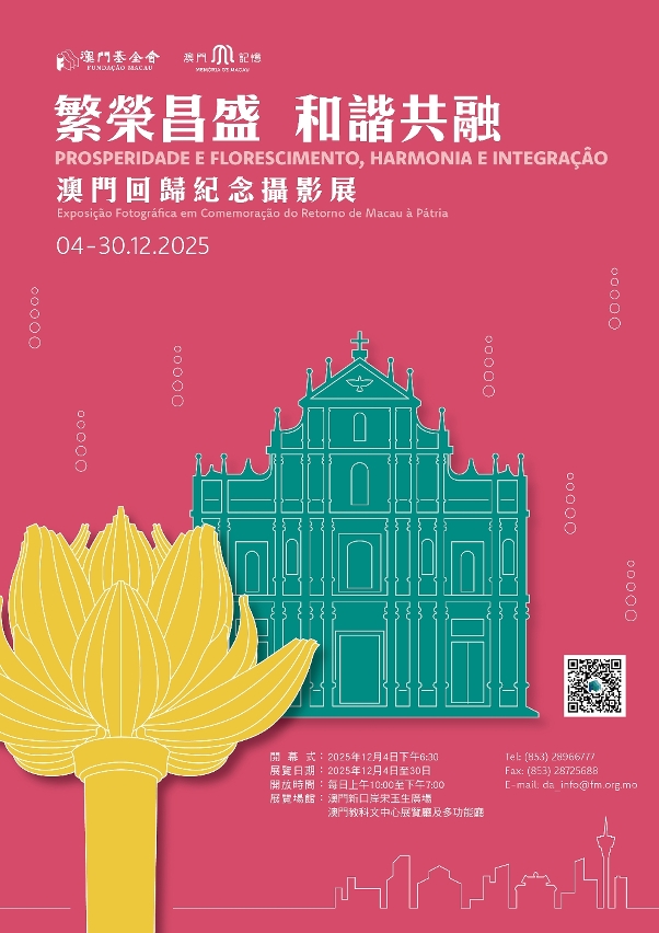 為慶祝澳門回歸祖國廿六周年,由澳門基金會主辦的“繁榮昌盛 和諧共融——澳門回歸紀念攝影展”將於2025年12月4日(星期四)18:30在澳門新口岸宋玉生廣場澳門教科文中心展覽廳及多功能廳正式開幕。