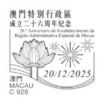 為慶祝澳門特別行政區成立二十六周年,郵電局特於二零二五年十二月二十日上午九時至下午二時,在郵政總局集郵商店設置臨時櫃台,為市民提供加蓋“澳門特別行政區成立二十六周年紀念”紀念郵戳服務。