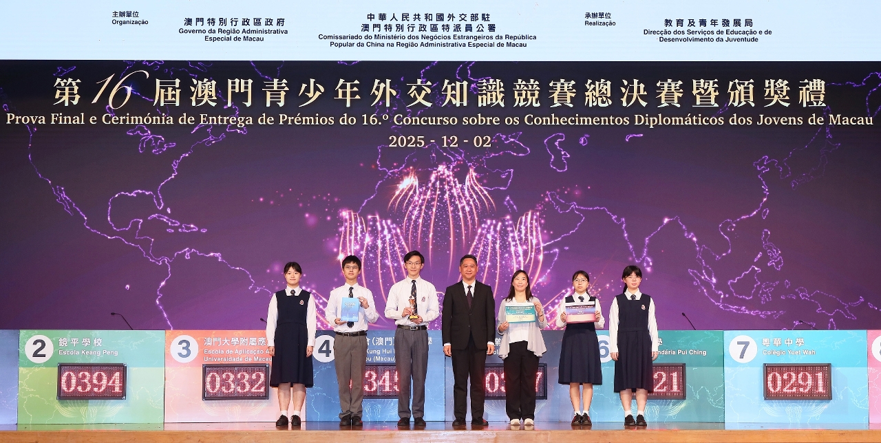 由澳門特別行政區政府與中華人民共和國外交部駐澳門特別行政區特派員公署主辦、教育及青年發展局承辦的第16屆澳門青少年外交知識競賽總決賽暨頒獎禮於12月2日舉行。競賽綜合考驗參賽學生對習近平外交思想、中國特色大國外交、涉澳外交、外交史、外交常識、時政熱點等的掌握和運用,得到特區社會各界廣泛支持。本屆參與的學校共37所,學生人數超過 9,000人,由推廣賽、初賽到脫穎而出進入總決賽的8支隊伍,經過一輪緊張的外交知識較量,最終由鏡平學校獲得冠軍,濠江中學、聖公會(澳門)蔡高中學、教業中學分別獲亞軍、季軍和殿軍,澳門大學附屬應用學校、培正中學、勞校中學、粵華中學獲優異獎。