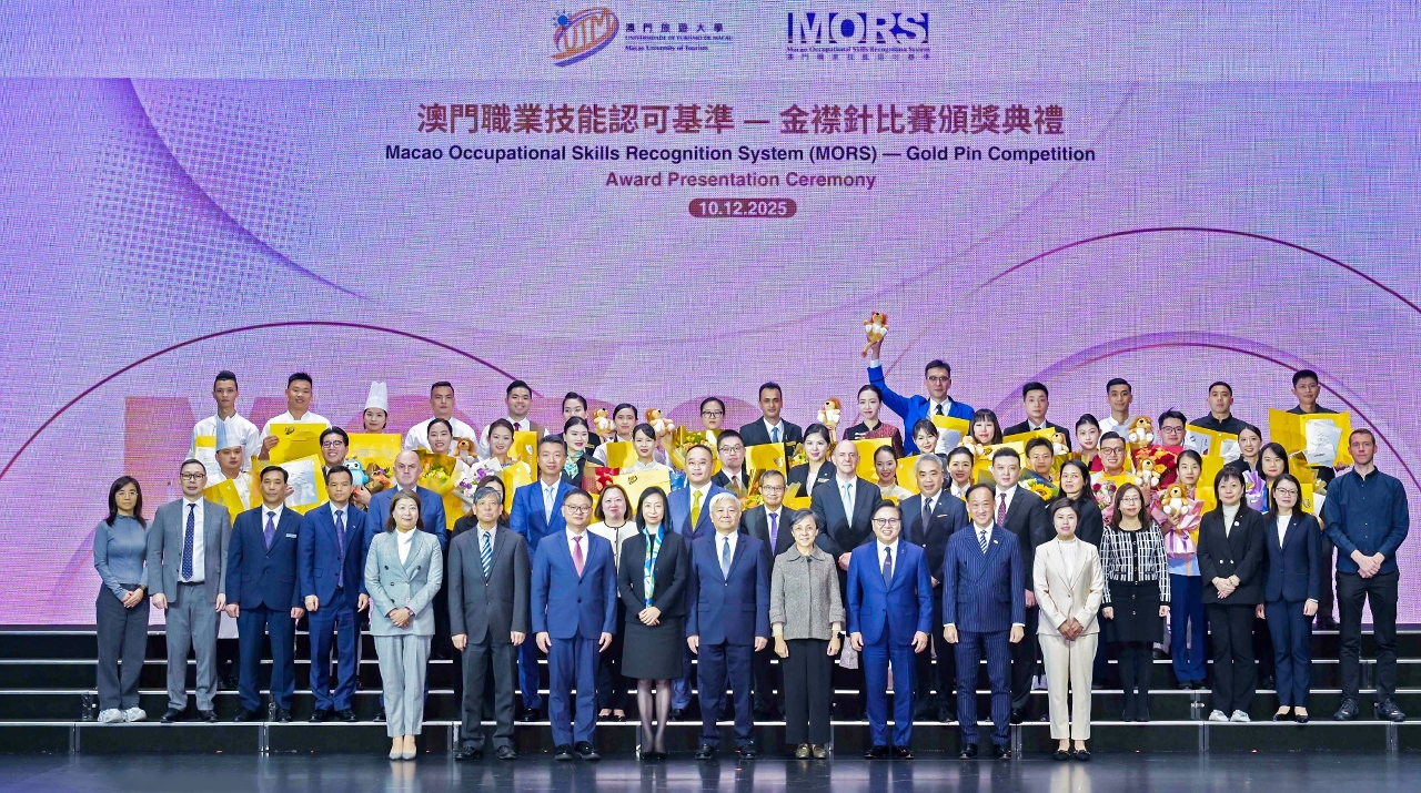 澳門旅遊大學於 2025 年 12 月 10 日舉行“澳門職業技能認可基準(MORS)”金襟針比賽頒獎典禮。出席嘉賓包括澳門旅遊大學校董會主席陳澤武、澳門旅遊大學校長黃竹君、澳門特區政府旅遊局局長文綺華、勞工事務局局長陳元童、金沙中國有限公司行政副主席王英偉、澳門酒店旅業職工會會長李寶來及澳門酒店協會理事長鍾友雄。