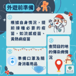 居民應根據自身健康狀況及了解旅遊目的地近期是否有疾病或特殊健康風險存在,並採取相應預防措施。例如,外遊前可接種季節性流感疫苗;前往黃熱病疫區必須按要求接種黃熱病疫苗等。居民需注意接種不同疫苗產生有效抗體的時間有所不同,如黃熱病疫苗接種後約10天可產生有效抗體,季節性流感疫苗一般需2-3星期才產生有效抗體,故此建議外遊前結合出行時間提前做好規劃。出行時請準備足夠口罩及消毒用品以備不時之需。