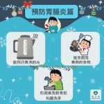 - 預防胃腸炎:建議選擇衛生條件良好的餐飲場所,避免生食或進食未煮熟的食物。飲食前及如廁後務必洗手,只飲用煮沸的水或可靠來源的瓶裝水,避免進食未經徹底煮熟的食物。