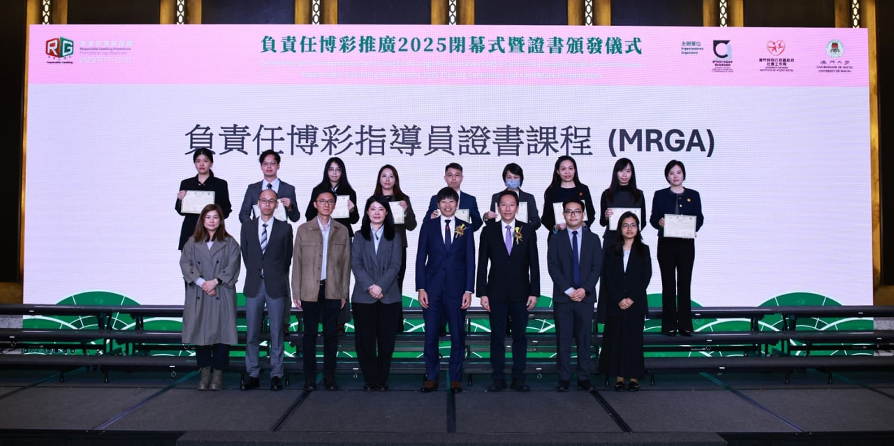 由社會工作局、博彩監察協調局及澳門大學博彩研究所合辦的“負責任博彩推廣2025閉幕式暨證書頒發儀式”,於12月17日下午在美獅美高梅酒店宴會廳順利舉行,來自博彩業界、社會服務界及學術界專家學者逾180人出席。