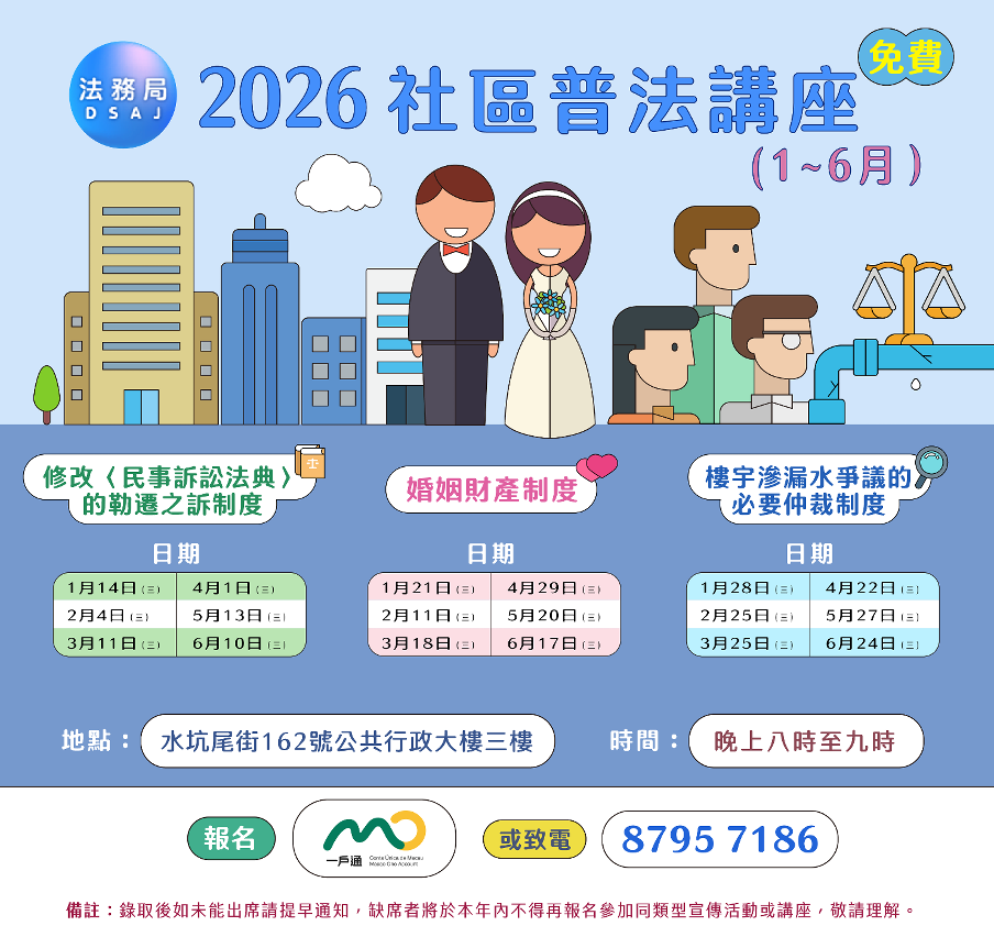 為增進市民對日常生活法律的認識,法務局將繼續舉辦社區普法講座,內容涵蓋三大主題:“婚姻財產制度” 、“樓宇滲漏水爭議的必要仲裁制度”以及“《修改〈民事訴訟法典〉的勒遷之訴制度》”。講座透過條文講解、個案分析及互動問答等方式,深入淺出地闡釋法律內容,協助市民掌握相關知識,以更好地保障自身權益。