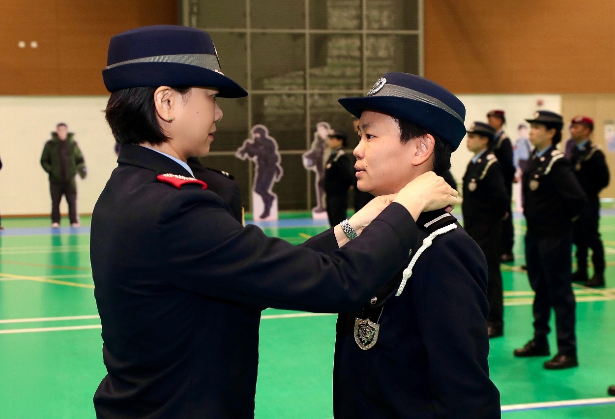 今(7)日上午,治安警察局在總部大樓舉行副警長晉升儀式,儀式由伍素萍代局長主持,梁慶康副局長、鄭俊禧代副局長及各部門主管出席儀式。儀式上,各位晉升的副警長正式戴上新的肩章,標誌著晉升人員肩負起更大的責任和使命。