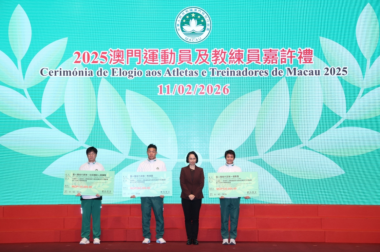為表彰在2025年度參加體育比賽中獲得優秀成績的本澳運動員、教練員及技術輔助人員,以及為鼓勵澳門體育代表團在今年各項大型體育賽事中創造佳績,「2025澳門運動員及教練員嘉許禮暨2026體育代表團誓師儀式」昨(11)日晚上七時半舉行,社會文化司司長柯嵐等出席儀式,勉勵並祝賀一眾運動健兒。
