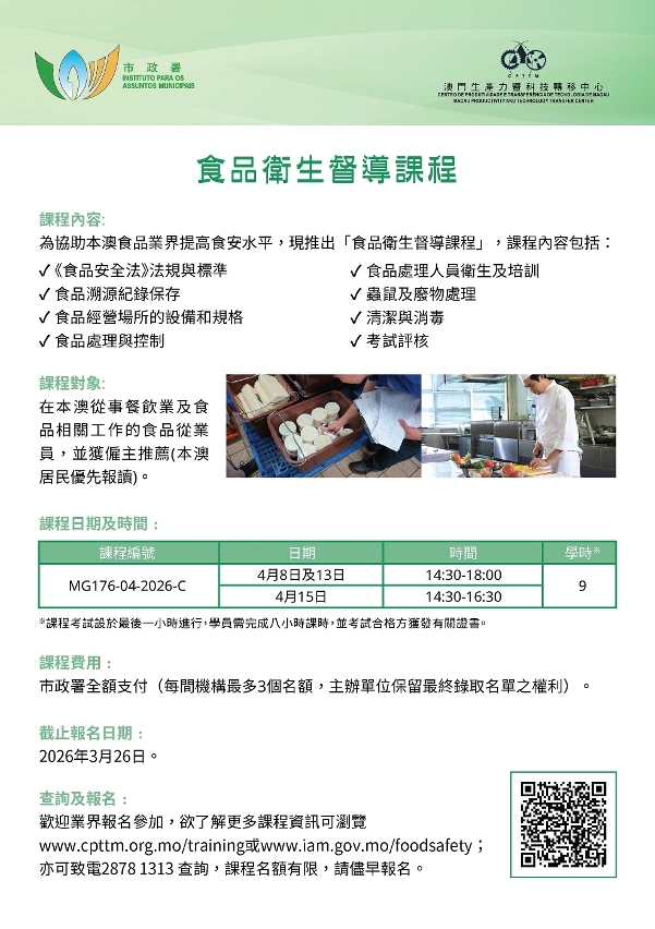 四月份“食品衛生督導課程”現正接受報名,報名日期至三月二十六日,有關課程資訊或報名詳情可掃描宣傳單張上的二維碼、瀏覽市政署食品安全資訊網 www.iam.gov.mo/foodsafety、澳門生產力暨科技轉移中心網站 www.cpttm.org.mo/training,或致電2878 1313查詢。
