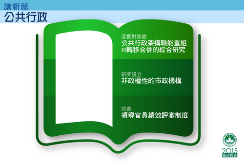 時代在向前,澳門在發展,客觀趨勢和廣大居民都對特區政府治理能力及水平提出了更高的要求。政府會乘大勢、順民意,在積極作為中改善不足,不斷提高政府執行力和公信力。 善治離不開政府科學而有效的治理,更離不開居民的積極參與和支持。我們會不斷增強施政透明度,依法保障新聞自由、出版自由和言論自由。加強政策研究,提升政府回應速度和質量,增強政策解說能力,確保政府與社團和居民的良好互動。今年將落實整合和精簡諮詢組織,建議規範所有諮詢組織每屆任期為兩至三年,社會人士成員可連任兩至三屆,但最長不超過六年,最多可同時出任三個諮詢組織。 落實精兵簡政是特區政府施政的重點。今年,落實對整個公共行政架構職能重組和轉移合併的綜合研究,並改善跨部門合作機制,提升公共行政效率。此外,根據《澳門基本法》的相關規定,研究設立非政權性的市政機構。 公務人員是特區政府寶貴的人力資源財富,我們十分珍惜。今年全面檢討中央招聘制度的入職及分配,研究修訂《公務人員職程制度》,重新評估各級公務人員,特別是基層公務人員的薪酬水平和購買能力,適時推出相應的補助和福利措施。同時,發揮公務人員薪酬評議會的職能,開展“公務人員分級調薪制度”的研究,充分調動公務人員的積極性。優化培訓工作的質量,提升公務人員素質,更好地為特區建設服務。 落實建立各級政府部門的責任制,增強各級官員的責任意識,明確其施政責任,確保政策協調落實。完善領導官員績效評審制度,實現官員問責制度與領導官員績效評審制度的結合,形成“績效導向”和“權責相當”的行政文化。 我們清醒地看到,特區法制建設尚未能完全配合和適應經濟社會的發展。政府將全力加強法制建設,抓緊完善基礎性法律,尤其是民生事務法律的立法工作。檢討《公共工程承攬合同之法律制度》的執行情況,嚴格監督公共工程的進度;根據《澳門基本法》規定的量入為出原則,遵從盈餘預算的要求,爭取今年完成《預算綱要法》修訂方案,並開展諮詢,以加強公共支出的監管。 堅持司法獨立的原則,繼續完善司法軟、硬件建設,優化司法培訓機制,合理規劃司法人員培訓的長遠目標。 政府將一如既往地重視廉政建設,充分發揮廉政公署、審計署的監察職能,積極配合立法機關的監督工作,誠懇接受公眾及傳媒對施政的監督,強化依法施政,維護特區政府的公正廉潔。 我們將嚴格貫徹《澳門基本法》和全國人大常委會的相關決定,從澳門實際出發,持續提高民主選舉素質,培育健康的選舉文化,廣泛聽取社會各界對於政制發展的訴求,充分凝聚共識,穩步推進特區民主政治發展。