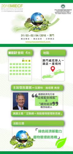 「2016年澳門國際環保合作發展論壇及展覽」(2016MIECF)將於下周四(3月31日)起一連三天假澳門威尼斯人-度假村-酒店舉行。經過9年的孕育及發展,MIECF已逐步成為泛珠三角地區乃至國際環保業界間共享技術、資訊及拓展商務的平台。 自2008年首屆MIECF開始,泛珠「9+1」省(區)便一直作為協辦單位,每年亦組織高層次代表團來澳參展參會,使MIECF成為泛珠三角區域合作框架下的環保品牌活動。 逾215間泛珠參展單位聚首2016MIECF 將於3月31日至4月2日舉行的2016MIECF,參展商數目超過460家,展覽面積約為16,900平方米,吸引來自超過20個不同國家及地區的展商參與。其中今屆MIECF繼續得到「9+1」省(區)政府及有關單位的鼎力支持,並吸引逾215間相關參展單位參與。 搭建泛珠環保合作新橋樑 今年除續舉辦針對「泛珠三角區域」的環保論壇環節外,更新增設「泛珠三角區域環境保護技術交流會」。在國務院日前發佈《關於深化泛珠三角區域合作的指導意見》下,泛珠三角區域就環保範疇的緊密合作將有更深層次的體現。 「泛珠三角區域環節-泛珠三角區域固體廢物處理處置政策及技術座談會」將於4月1日下午3時15分在西西里廳 (2401-2502)舉行。會議將介紹各省(區)固體廢物處理處置的最新政策,交流先進的固體廢物處理處置技術及産品。而「泛珠三角區域環境保護技術交流會」於同日下午5時在西西里廳前廳舉行。除「9+2」省(區)外,還邀請到歐洲、葡語國家、美國以及東南亞等環保行業精英聚首一堂,就個別的環境保護技術轉移與合作進行深入交流。有關2016MIECF活動詳情請瀏覽大會網頁http://www.macaomiecf.com/miecf2016 。