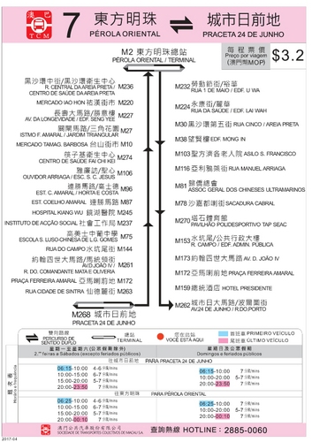 7和7A路線將於4月9日(周日)起合併為新7路線,延伸服務至皇朝區,並取消行經新馬路至媽閣一段行程,以加快周轉時間提升班次密度至4至7分鐘一班,有助加強疏導北區、新橋區一帶乘客,並紓緩新馬路的交通壓力。交通事務局同步亦調整5路線經高士德大馬路往媽閣,方便新橋區及三盞燈一帶的市民乘坐該路線前往新馬路或媽閣。