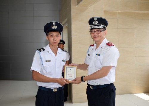 入職儀式由關長黃有力主持,一眾學員於宣誓後,由關長為其戴上肩章,正式成為海關關員。黃有力關長於致辭時,寄語他們未來在工作崗位上要保持無私、熱心之精神,盡力服務市民。黃有力同時又感謝前線人員的付出,在風災期間堅守崗位,全力參與救災工作。