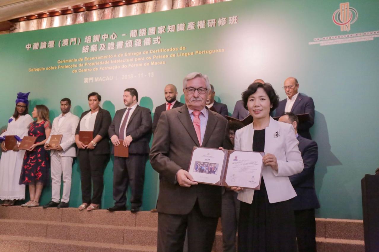 由中葡論壇(澳門)培訓中心主辦、澳門城市大學承辦的“葡語國家知識產權研修班”於11月13日假澳門美高梅宴會廳舉行結業典禮暨證書頒發儀式。