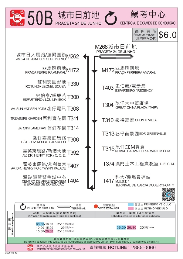 亞馬喇前地整治第一期土建工程首階段將於日內完成,接續於3月12日(周四)啟動次階段施工,同日首班車起,“亞馬喇前地"站C車道封閉,B及C車道巴士路線臨時調整停靠位置,詳見附表。同時,50、50B、52及71路線巴士調整為永久循環線,取消以“亞馬喇前地”站為總站。交通事務局呼籲乘客留意。