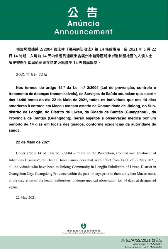 新型冠狀病毒感染應變協調中心宣佈,因應廣東省的疫情變化,衛生局根據第2/2004 號法律《傳染病防治法》第14 條的規定,自 2021年5月22日下午2 時起,所有在入境前14天內曾經到過廣州市荔灣區龍津街道錦龍社區的入境人士,須按照衛生當局的要求在指定地點接受14 天醫學觀察,違反者除可能依法承擔相應的刑事責任外,尚可被採取強制隔離的措施。