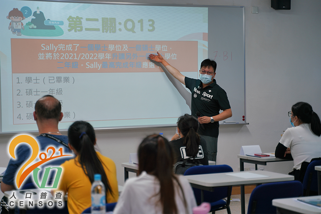 為確保培訓工作順利完成,統計局派出50位導師,合共72班為約2,600名學員進行普查員課堂培訓。内容包括理論與實踐兩個方面,導師會教授普查員各樣專業知識及技能,包括問卷內容、住戶訪問技巧、特別情況的應變方法,以及設備操作等。此外,人口普查熱線操作員及組長須接受額外的相關培訓。培訓學員的網上學習成績及課堂培訓期間的表現將作為整體評核的依據,合格的學員才被錄取參與8月的人口普查資料收集工作。