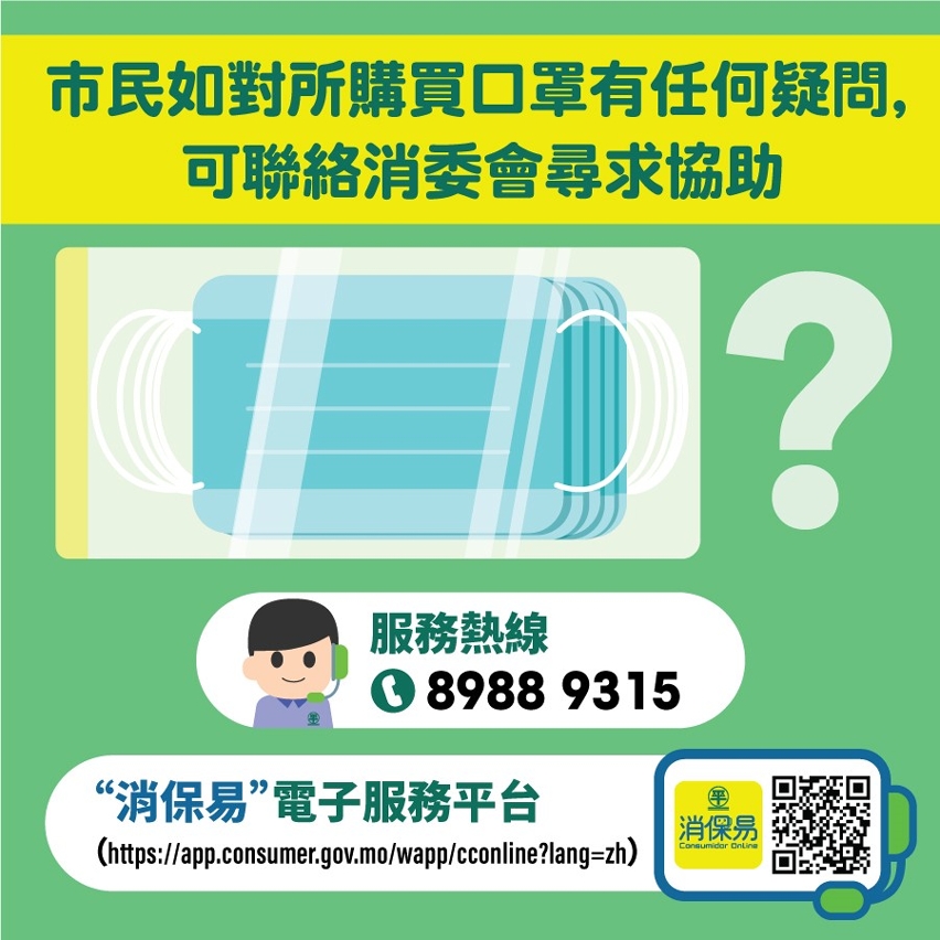 購買了相關品牌同一批次口罩的居民,如對所購買口罩有任何疑問,可致電消委會熱線8988 9315,或透過“消保易”電子服務平台(https://app.consumer.gov.mo/wapp/cconline?lang=zh)尋求協助。