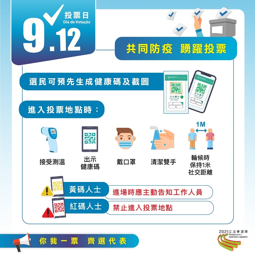 選管會呼籲,選民不應在到達投票地點時才生成健康碼,以免造成入口處的群聚情況,為此,選民進入投票地點也可出示9月11日的健康碼截圖,又或於投票日儘早生成健康碼。