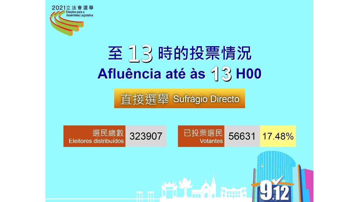 9.12立法會選舉投票已進行了4個小時,截至下午1時,直選共有56,631人投票,投票率為17.48%;間選共有2,613人投票,投票率為32.6%。