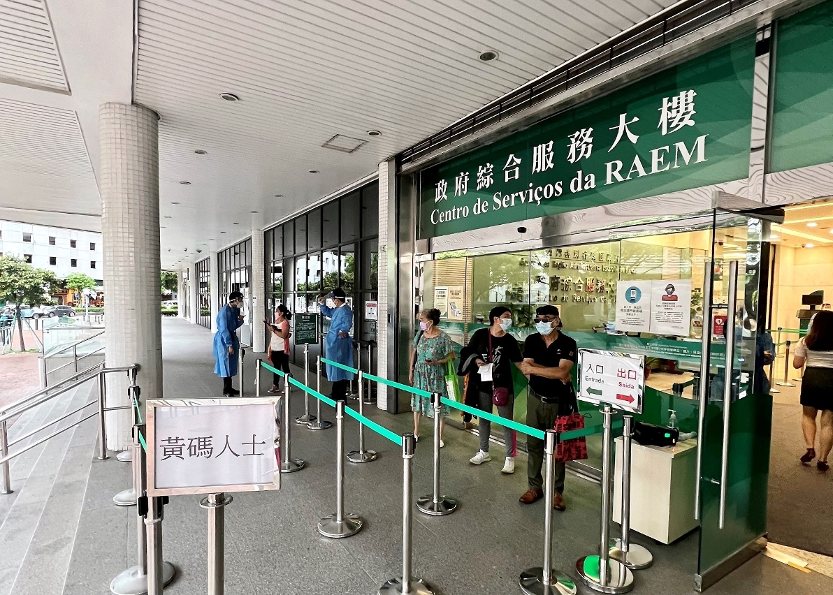 黑沙環政府綜合服務大樓、離島政府綜合服務中心於今(4)日起恢復運作,提供有限度對外公共服務。現場設有“黃碼人士專道”,排隊市民亦自覺保持一米距離,秩序良好。配合防疫,避免人群聚集,市民應先透過 www.csraem.gov.mo/csrbooking/ 預約,再按時間到場辦理服務,查詢可致電2845 1515或28421212。