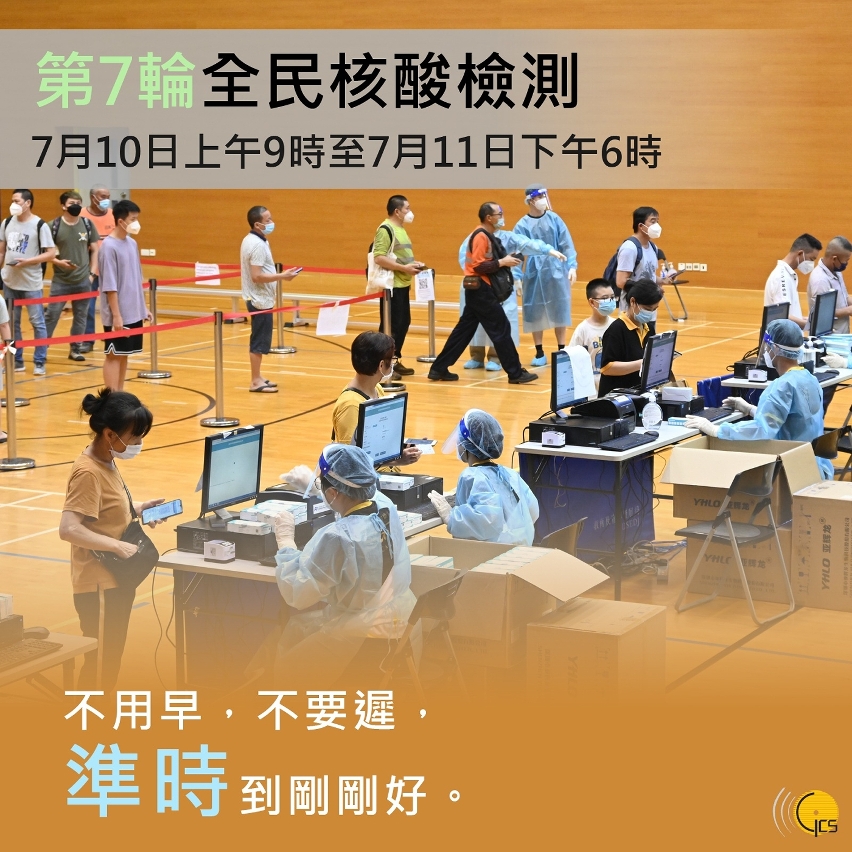 第7輪全民核酸檢測由7月10日上午9時至7月11日下午6時展開。不用早,不要遲,準時到剛剛好。