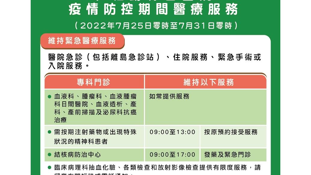 自2022年7月25日零時至7月31日零時,各衛生中心及衛生站門診服務、公務員體檢中心均暫停,各衛生中心每日上午 9 時至下午 1 時只提供護理服務。