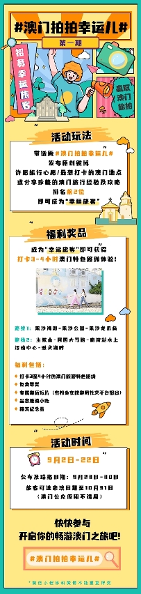 “澳門拍拍幸運兒”為結合線上線下的亮點宣傳工作。旅遊局積極擴客源市場,同時將密切留意疫情發展,配合衛生部門發出的相關指引,有關活動安排將以澳門疫情防控工作為先,適時調整工作計劃。