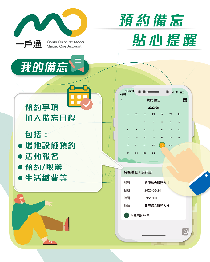 市民進行場地設施預約或活動報名時,由於“一戶通”已確認本人身份,無須再輸入個人資料。成功預約或報名後,在相關系統的申請記錄頁面可作查閱,同時還會把成功申請的事項自動錄入“我的備忘”,用戶可於“我的”頁面,點擊“我的備忘”以查看行事曆。對於即將到來的行程,“一戶通”會提前發送推送消息作出提醒。