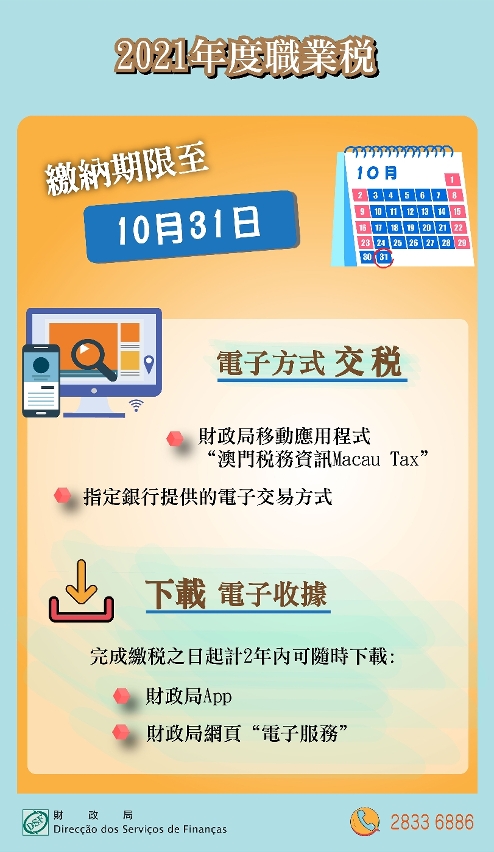 財政局提醒納稅人,職業稅2021年度稅款之最後繳納期限至10月31日(星期一)。為免因逾期繳納而附加過期利息及罰款,仍未繳納上述稅款之納稅人須儘快繳納。