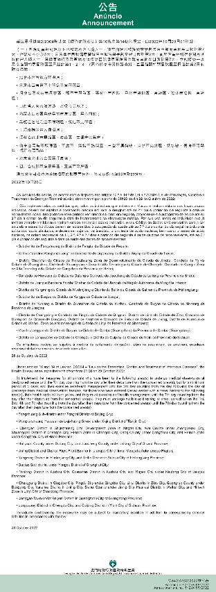 新型冠狀病毒感染應變協調中心(下稱應變協調中心)宣佈,因應內地的疫情變化,衛生局根據第2/2004號法律《傳染病防治法》第10條和第14條的規定,自2022年10月29日凌晨1時起,新增或取消對曾到內地相關區域人士的防疫措施: