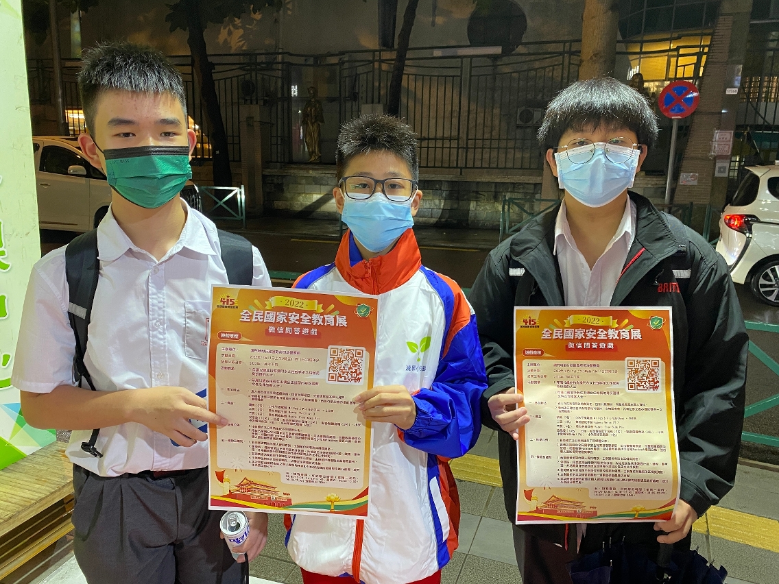 10月中旬,司警局人員聯同“社區安全青年領袖計劃"及“滅罪小先鋒種子計劃"學員走訪本澳各區,向社會大眾特別是青少年、學生及外地僱員推廣 “2022全民國家安全教育展微信問答遊戲",並展示進入遊戲頁面的二維碼方便他們即場掃碼參與活動。期間,公眾對活動反應熱烈,有參與活動的學生表示,透過富趣味性的問答遊戲能喚起青少年關注國家安全的議題,鞏固他們對國家安全內容的認識,從而培養民族意識和愛國愛澳情懷;亦有外僱參與者認為,活動能進一步提升居民對國家的認同和國安意識,有助樹牢總體國家安全觀,推動全社會更好維護國家與特區的安穩。
