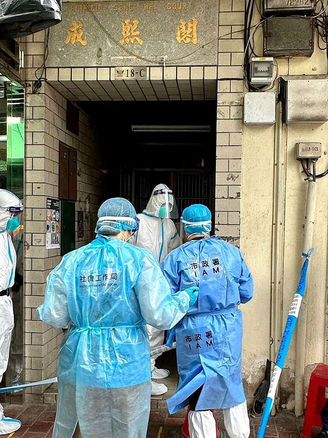 市政署聯同治安警察局及社會工作局組成維生支援小組,已對紅碼大廈開展住戶調查,掌握實際居民數量及基本需要,以便供應生活物資。同時,協助衛生局有序地分批安排圍封大廈每名居民接受病毒核酸篩查採樣。