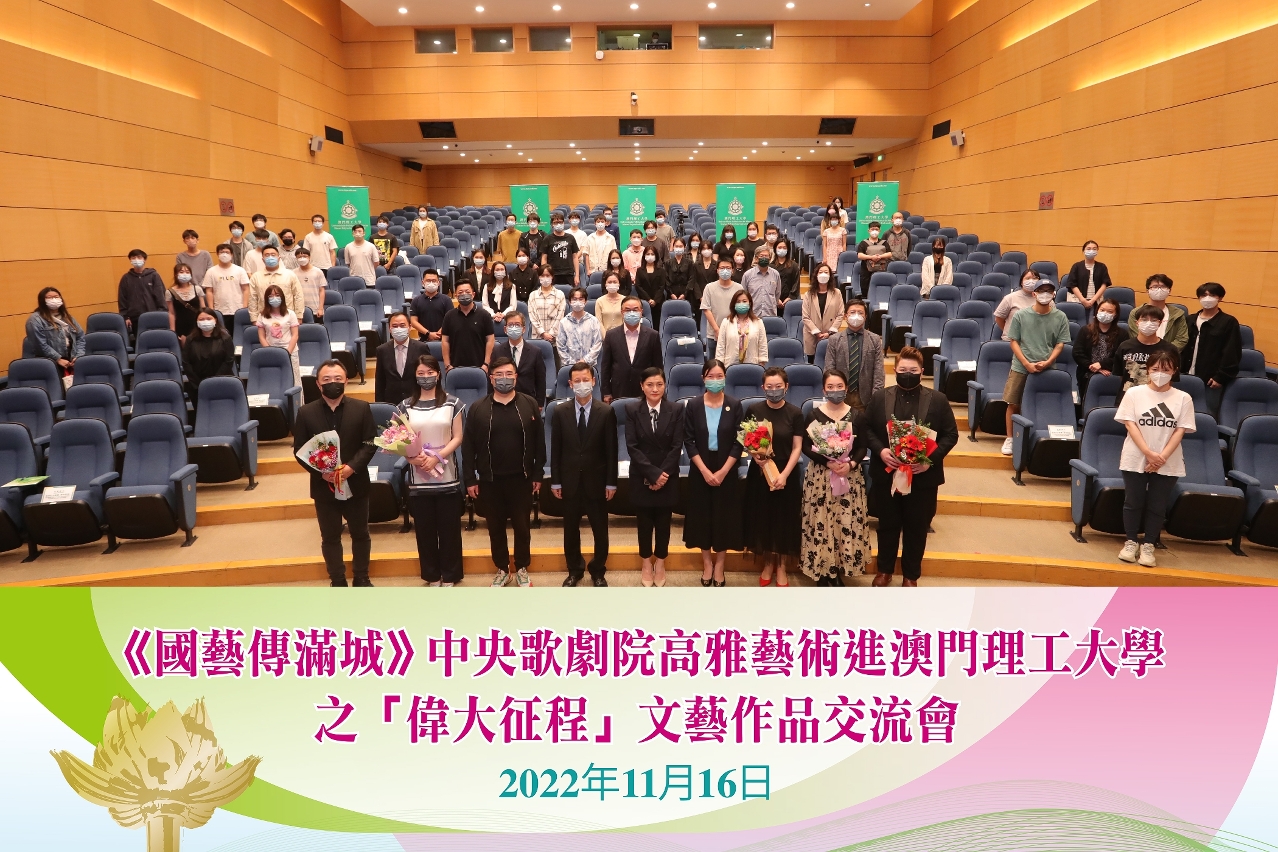 《國藝傳滿城》中央歌劇院高雅藝術進澳門理工大學之“偉大征程”文藝作品交流會於11月16日下午三時在澳理大禮堂舉行,中聯辦宣文部副部長殷汝濤、國家一級演員、中央歌劇院副院長么紅、國家一級演員、中央歌劇院主任張鵬、澳門理工大學副校長李雁蓮、文化局代表澳門演藝學院院長周游、教青局學生廳廳長陳旭偉、澳門理工大學藝術及設計學院院長黎明海、音樂課程主任代百生、音樂課程副教授梁詠茜、公共關係辦公室主任陳玉玲等嘉賓與師生們一起欣賞交流會。