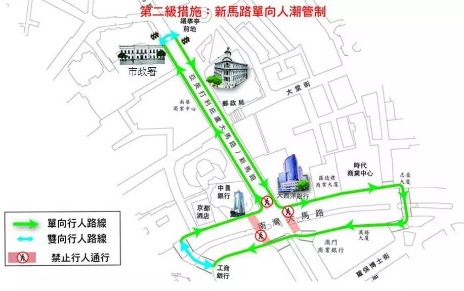 當第一級措施未能解決人群持續擠擁問題時,在第一級的基礎上,新馬路將實施單向人潮管制。行人需遵照附圖所示‘倒T’字型單向行進路線前往議事亭前地、大西洋銀行、滙豐銀行、商業銀行、工商銀行、中國銀行及市政署等地點。