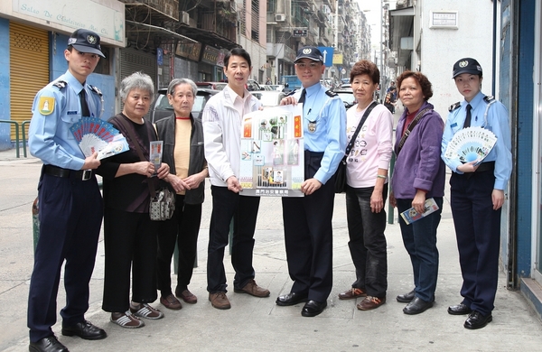 今日上午,治安警察局分別與水荷雀坊會、提柯區坊會聯合進行社區防罪宣傳活動,本局行動廳副警司黃超文、劉國熙、澳門警務廳警長林錦豪等帶領三個宣傳小隊,聯同兩坊會負責人劉桂雲、李偉民、謝穎斐、陳炳洪及多名坊會義工,到區內多個地點發掘警情,向街坊派發防罪宣傳品,帶出注意家居防盜、警民合作的信息。 是次聯合宣傳活動包括傳遞信息及問卷訪談兩部份組成,首先本局人員與坊會代表及義工,同一時間在雀仔園區、東望洋新街、沙加都喇街、亞豐素街、俾利喇街以及三盞燈等一帶低層住宅大廈,派遞傳單及張貼海報,親身聽取居民的個案經歷及治安需求,沿途帶出防罪訊息;同一時間,亦在宣傳範圍向街坊即場進行問卷調查,收集治安情報,亦派發各種防罪小冊子,講解家居防盜及保護個人財物之注意事項,呼籲遇事報警求助,警民互通情報,攜手滅罪。 是次與坊會再度進行聯合宣傳活動,具有深化警民關係的意義,本局感謝坊會及居民的肯定和支持,配合警方的宣傳工作,並主動提供治安情報,有助社區警務的執行。稍後,本局將會繼續深化與社區的定期接觸,與坊會密切合作,宣揚防罪滅罪訊息,致力攜手打造一個安全的城市。