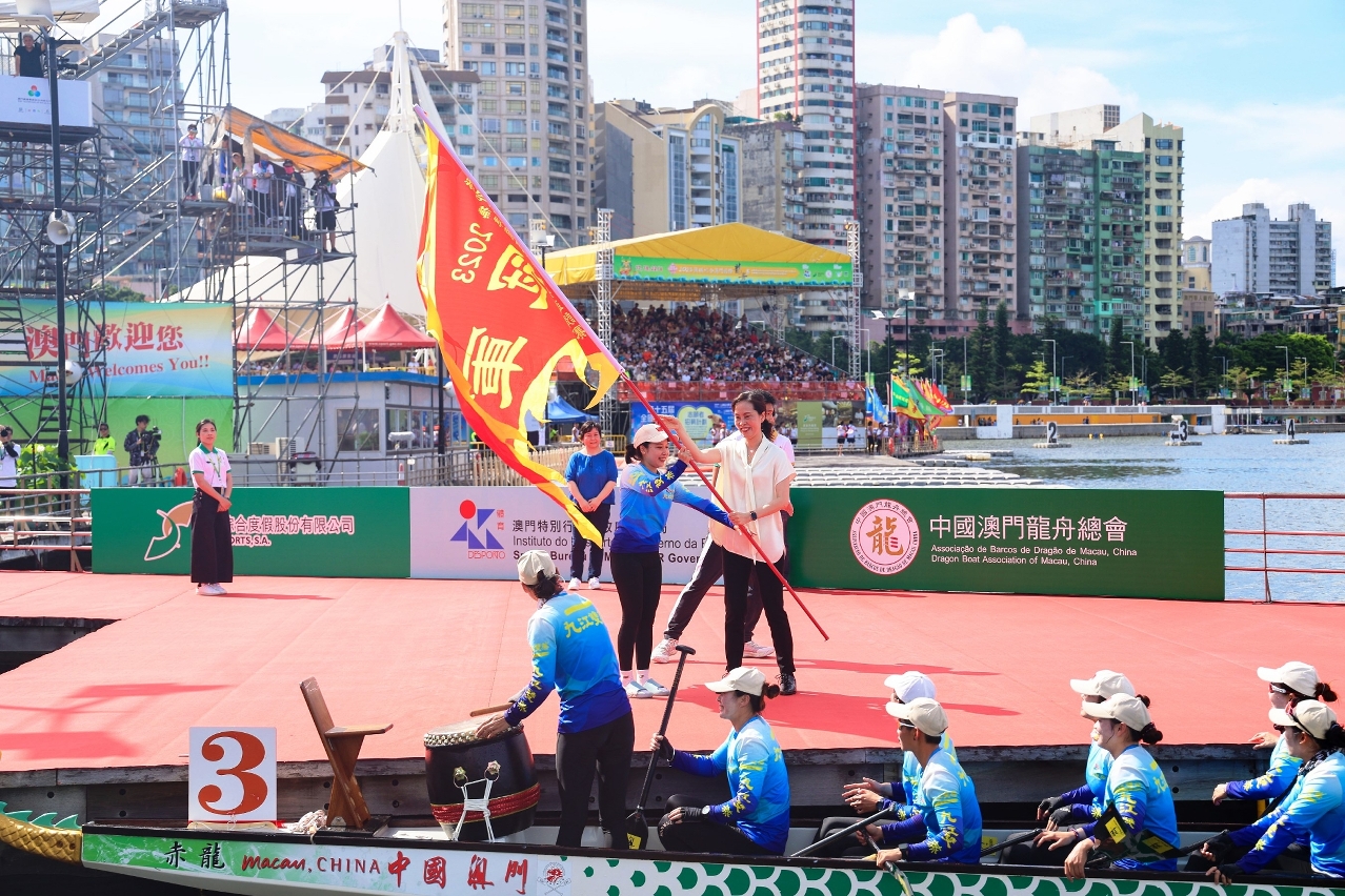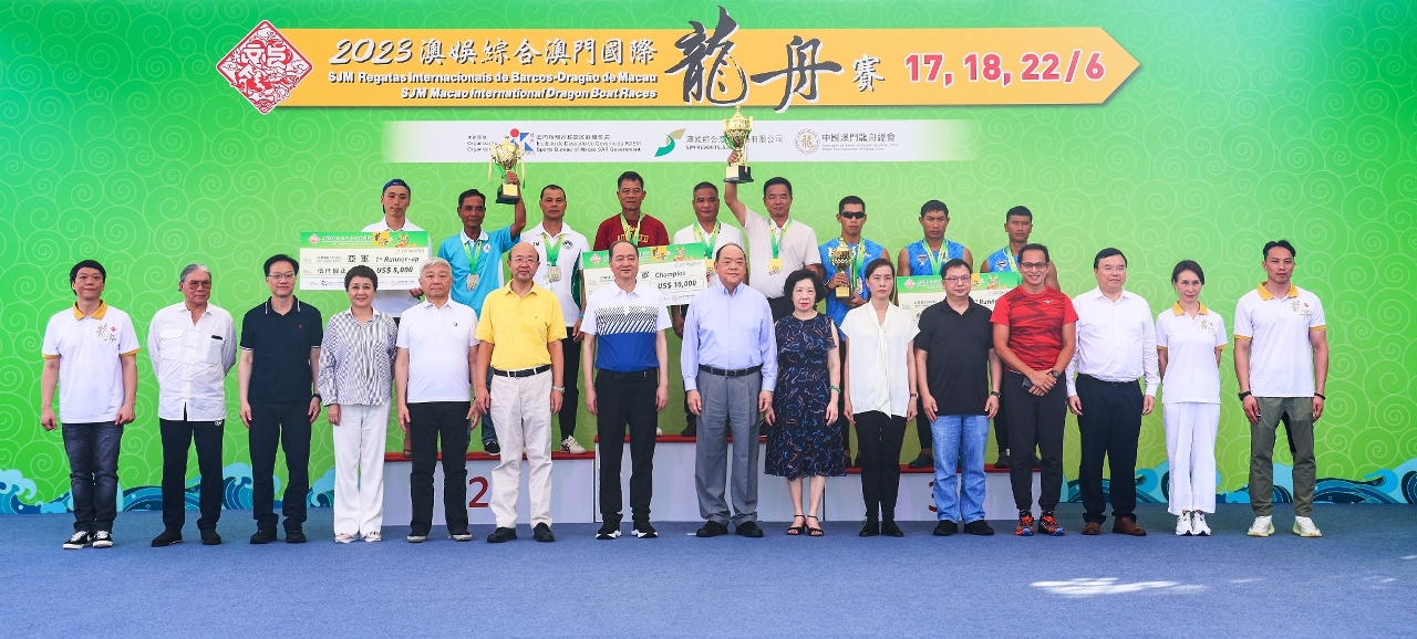 由體育局、澳娛綜合度假股份有限公司、中國澳門龍舟總會主辦,市政署及行政公職局協辦的“2023澳娛綜合澳門國際龍舟賽”,今日(22日)端午節於南灣湖水上活動中心進行壓軸日賽事,經過連場激戰,最終中國南海九江勇奪標準龍500米公開組及女子組冠軍,而大學生邀請賽標準龍500米公開組由泰國卡西特大學奪得。行政長官賀一誠出席活動觀賞龍舟賽事,並主持點睛儀式及頒獎,與市民歡度端午佳節。