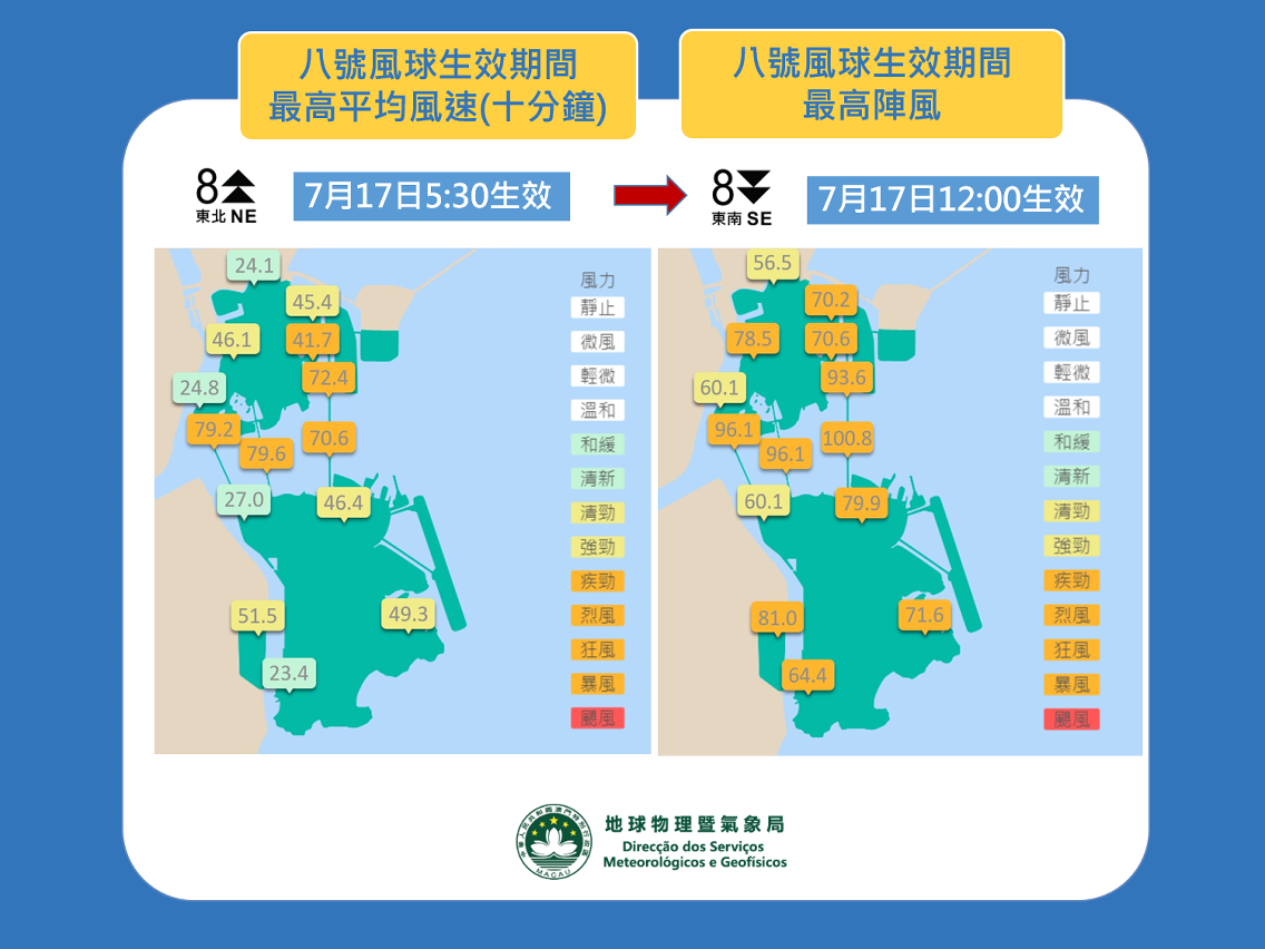 八號風球生效期間,由於「泰利」相當穩定地向西北方向移動,與本澳持續保持200-250公里的距離,故受其烈風圈(8級風區域)的持續影響,本澳三條大橋的最大10分鐘平均風速普遍錄得8-9級,最大陣風達10級(圖1)。