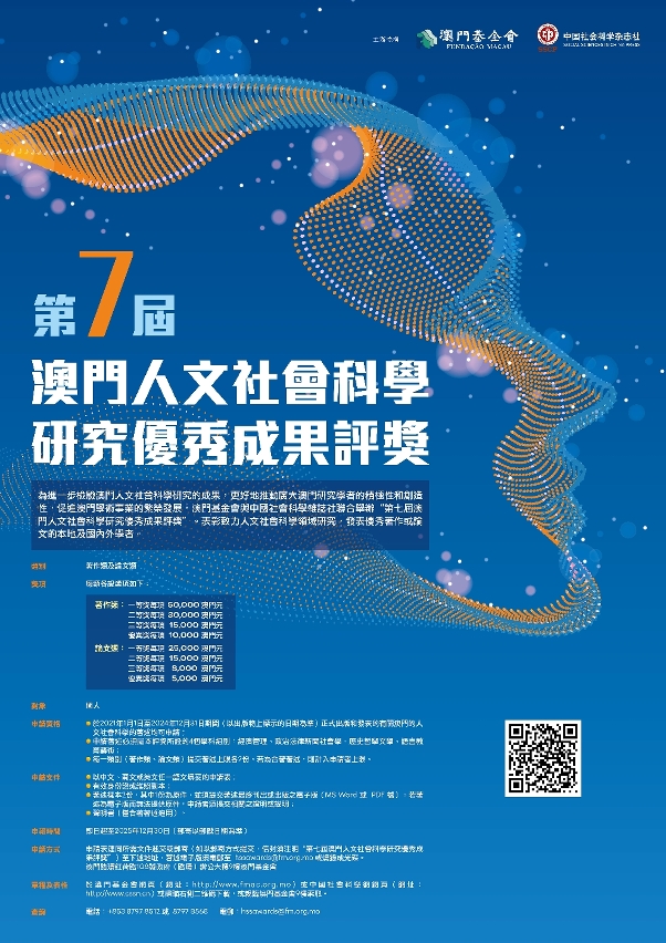 由澳門基金會和中國社會科學雜誌社聯合舉辦的 “第七屆澳門人文社會科學研究優秀成果評獎” 於即日起至2025年12月30日接受申請。