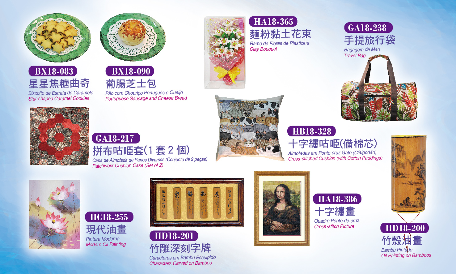 麵粉黏土擺設、刺繡、彩繪油畫、木製擺設、布藝製品、貝雕及竹浮雕擺設、成品製衣、麵包西餅及盆栽等。
